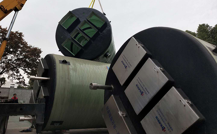 从外部看,江苏一体化提升泵站像一个大型的圆圆的筒体,因为现在大多采用玻璃钢做筒体材料,所以大多呈现浅绿色。当然这可不是简单的水桶,里面有很多设备。