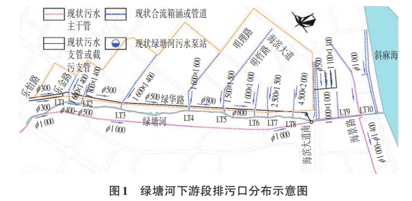 绿塘河下游段南侧已建污水主管,上游接驳人民大道污水主管,沿绿塘河南侧敷设,污水管管径为1000~01 200,管道长约3.5 km,下游接驳海景路污水主干管,绿塘河南侧沿线污水排口均已进行截流改造,未出现晴天污水溢流的现象。北侧沿绿华路已建成污水支管,起点为乐怡路,沿线接驳乐金路、明理路明哲路等污水支管,终点于海滨大道处接入南侧污水主管。因北侧已建污水管网存在大量错、混、漏接,导致现状雨水管(渠)均变成合流管(渠)即使在晴天,仍有大量合流污水溢流至绿塘河,导致水体黑臭。