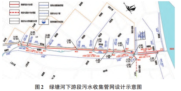 本项目治理目标为工程实施后实现晴天污水不入河,雨天污水少溢流,基本消除水体黑臭的考核要求。结合项目考核目标,以问题和目标为导向,通过梳理绿塘河主要污染来源,分析黑臭水体的成因,从流域综合治理视角出发,遵循“源、厂、网、河”系统性思维,提出控源截污、暗渠清污分流9、河道清淤、活水保质、生态修复等综合治理措施。综合考虑现状污水收集设施、项目投资、工程可实施性等因素,在控源截污措施方面设计拟沿绿塘河北侧新建污水主管,分别接入海滨大道、海景路污水主干管,沿线污水直排口接驳进污水主管,合流排污口通过设置截流井的方式收集合流污水及初期雨水,如图2所示,