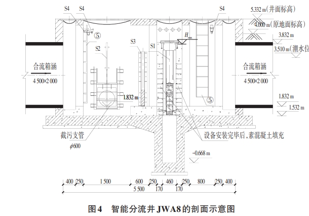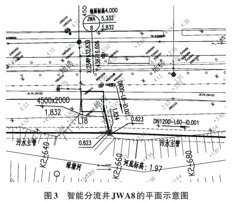 现以排污口LT8截流改造为例,说明智能分流井在排口改造中的应用。如图3、图4所示,现状排水口尺寸为 BxH=4 500 mmx2 500 mm,原建设为雨水箱涵然而现状却是晴天仍可见污水排出。通过地下管线探测及排水溯源摸查,发现上游存在多处错、混接的情况。受项目建设范围、内容、资金及工期等综合因素的限制,方案论证时建议近期完成排污口的合流制截流式改造,远期逐步完善雨污分流改造。排污口改造措施为箱涵末端处设置下开式堰门的智能分流井JWA8,近期将箱渠内的污水截流至污水主管,待远期完成上游雨污水错混接改造,并结合绿塘河综合治理措施实施后,实现雨天时将初期雨水截流至污水主管。JWA8下开式堰门分流井进出水管渠尺寸为4500mmX2 500 mm,井底标高维持原标高1.83m。根据其汇水面积范围预测的污水量及截流倍数计算确定截流管管径,管径不宜取值过大,避免截流量远超设计值,影响污水主管上下游污水收集,计算复核设计截流管管径为DN600。下开式堰门的顶部标高(4.53 m)应大于河道的防洪标准的高水位标高(3.69m),减少极端天气导致的河水倒灌现象。