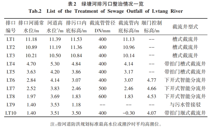 沿河排污口截流井的选择是控源截污重要措施之一,对流域治理效果的影响至关重要。根据绿塘河下游段排污口的服务范围、断面尺寸、管(渠)内底标高、河涌水位、潮位影响等因素,设计截流井选择需综合考虑多项因素,选取合理可行的截流井形式。LT1~LT3排污口,内底标高均在历年高潮位8.0m以上,即使在降雨且受潮位顶托时,河水倒灌的几率极低,可选择槽式截流井。LT4~LT5 排污口,内底标高在平均高潮位3.51m之上,在历年高潮位8.0m以下,日常受潮位影响较小,但在降雨且受潮位顶托或天文大潮时,存在河水倒灌风险,可选择带拍门的槽式截流井或智能分流井LT6~LT8排污口,内底标高在平均高潮位3.51m之下,选择槽式截流井时河水倒灌的几率极高,尤其是 LT7、LT8排污口断面尺寸较大,河水倒灌时,对污水主管水质水量的影响较大,容易导致上下游污水主管冒溢的现象可选择智能分流井或堰式截流井,但是选择堰式截流井在雨天时易导致上游内涝。LT9为污水直排口,应予以封堵,将污水就近接人市政污水管网。LT10内底标高在平均高潮位3.51m之下,应选择智能分流井或堰式截流井,然而受周边建设用地限制,只能选择堰式截流的方式将污水收集至污水管网。因此,各排污口的截流井设计选型如表2所示。