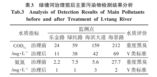 工程实施后,绿塘河下游段沿河的污水直排口实现晴天污水不人河,雨天污水少溢流,水体黑臭现象基本消除的治理目标,顺利通过广东省及生态环境部的考核评估。通过表3项目实施前后的监测数可知,水质得到极大的改善,由重度黑臭提升至V类水标准。