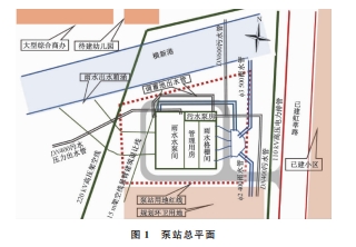 近年来,我国很多城市在雨水排水系统末端建设强排泵站时,增设初期雨水调蓄设施,将携带了雨天出流大部分污染负荷的初期雨水截流[1-31,于雨后利用污水管网设计充满度以外的空余容积输送至污水处理厂集中处理。大量初雨的排入将对中途污水提升泵站机组的稳定运行造成一定影响,对配泵选型提出要求。于此同时,随着城市化进程的加速,市政设施建设空间受限的情况逐渐成为常态!,如何在该类情形中,对泵站进行合理布置,保证各设施和机组稳定有效运行,并与周边环境最大程度地协调,也成为泵站设计过程中需要优化解决的问题。本文以九星雨污水合建泵站为例,讨论建设空间受限情形下,排水泵站与调蓄池合建的布置方案设计,以及应对初期雨水排放进行的配泵优化,