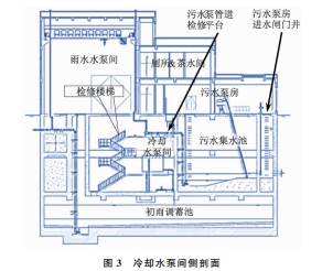 冷却水泵间及检修楼梯泵站利用雨水泵房北侧、调蓄池顶部的地下空仓,布置干式抽芯轴流泵需配备的冷却设施,并结合设置楼梯,一并解决电缆夹层、污水泵阀门安装平台、冷却水泵间及调蓄池的日常维护及检修需求,具体见图 2、图 3。