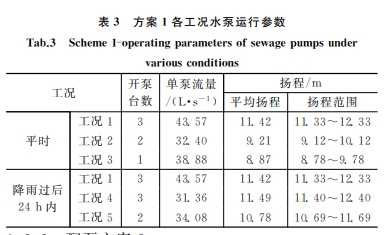采用变频器调节水泵运行参数,拟配3用1备共4台同种规格的潜水离心泵。以工况1的流量作为总配泵流量,进行扬程计算,得到需配备的单泵电机功率 15 kW。对各工况下水泵的运行参数进行校核,结果如表3,可见降雨过后24h内,泵站出水压力管内的流量差异较小,机组的平均工作扬程变化范围在7%以内;而旱天时,泵站出水压力管内的流量差异增大,平均及低峰流量时(工况2、3)水泵的工作扬程已偏离所配水泵的工作曲线,且对应的流量偏低。因此该方案中,为保证泵站旱天平均和低峰流量时的正常运行,有3台水泵需加设变频装置,