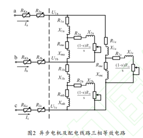 三相异步电机的核心由三相绕组构成,采用异步电机单相T型等效电路]三角形连接表示的异步电机三相等效电路如图2虚线右侧所示。图2中R、X为电机定子绕组的等效内阻和感抗:R石为电机转子绕组及负载换算到定子侧的等效内阻和感抗:R、X为电机等效励磁内阻和励磁感抗;虚线左侧表示配电线路的等效电路。