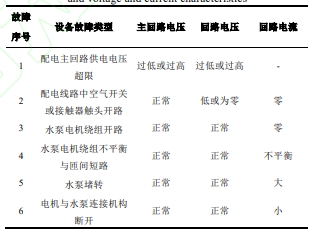 影响正常供水的泵房配电系统和设备主要故障有:配电主回路供电电压超限、配电线路中空气开关或接触器触头开路、水泵电机绕组开路、水泵电机绕组不平衡与匝间短路、水泵堵转、电机与水泵连接机构断开。其中电机绕组不平衡与匝间短路、水泵堵转等是一些文献关注的故障。