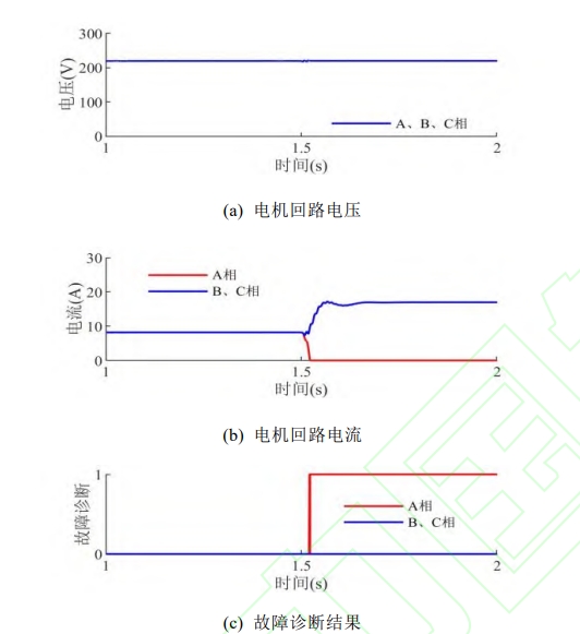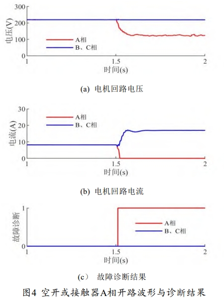 从图 4 中可以看出,在 1-1.5s,电机端电压均 维持在 220V 左右,回路电流为 8.2A,电机平稳运行,回路空气开关或接触器正常;t-1.5s时,空气开关或接触器A相触头发生开路故障,。下降其偏差满足式(11),下降且满足式(10),h和上升,使得电机三相电压不平衡、三相电流不平衡,得到故障诊断结果为A相为1,其它相为0.